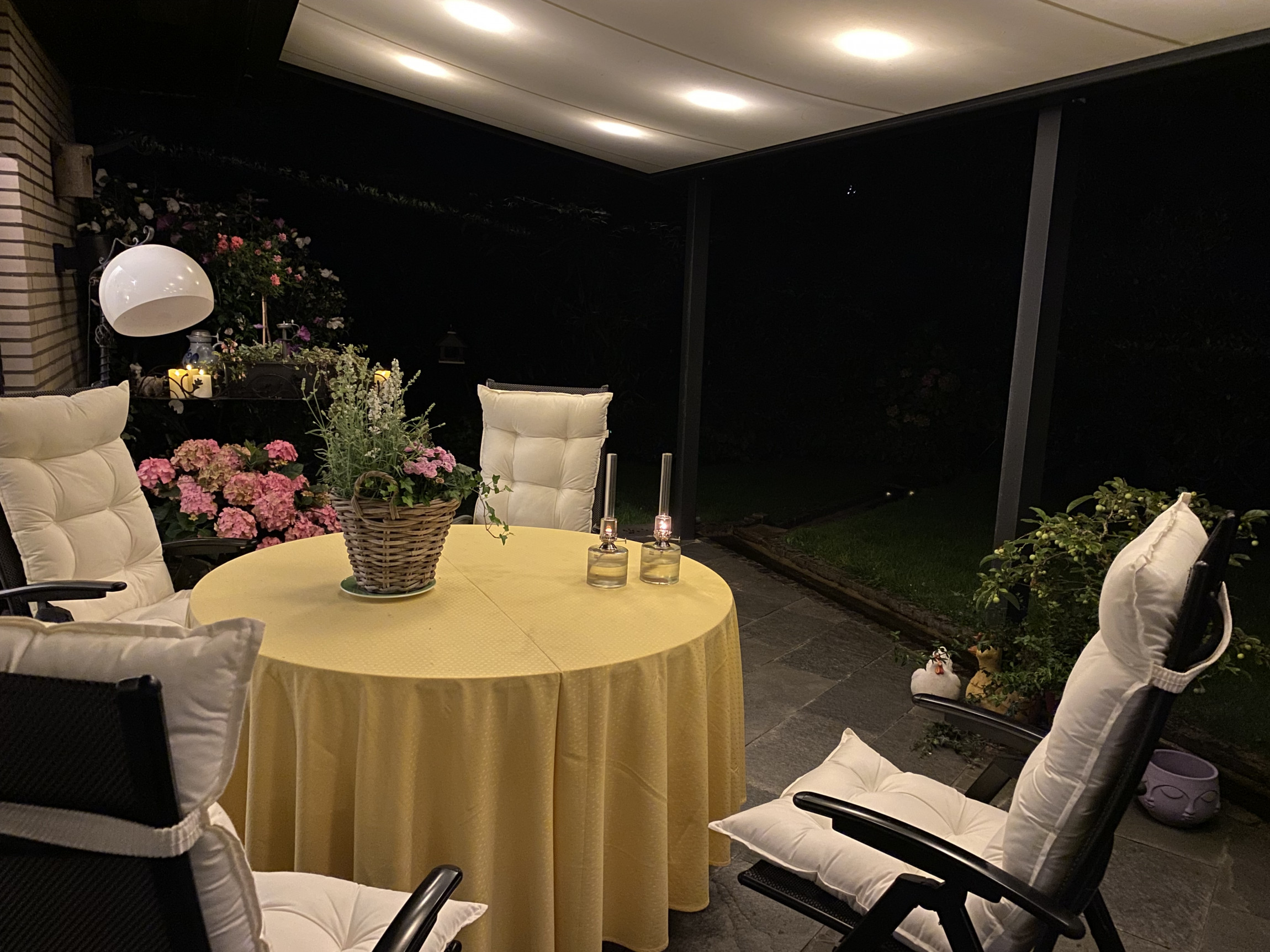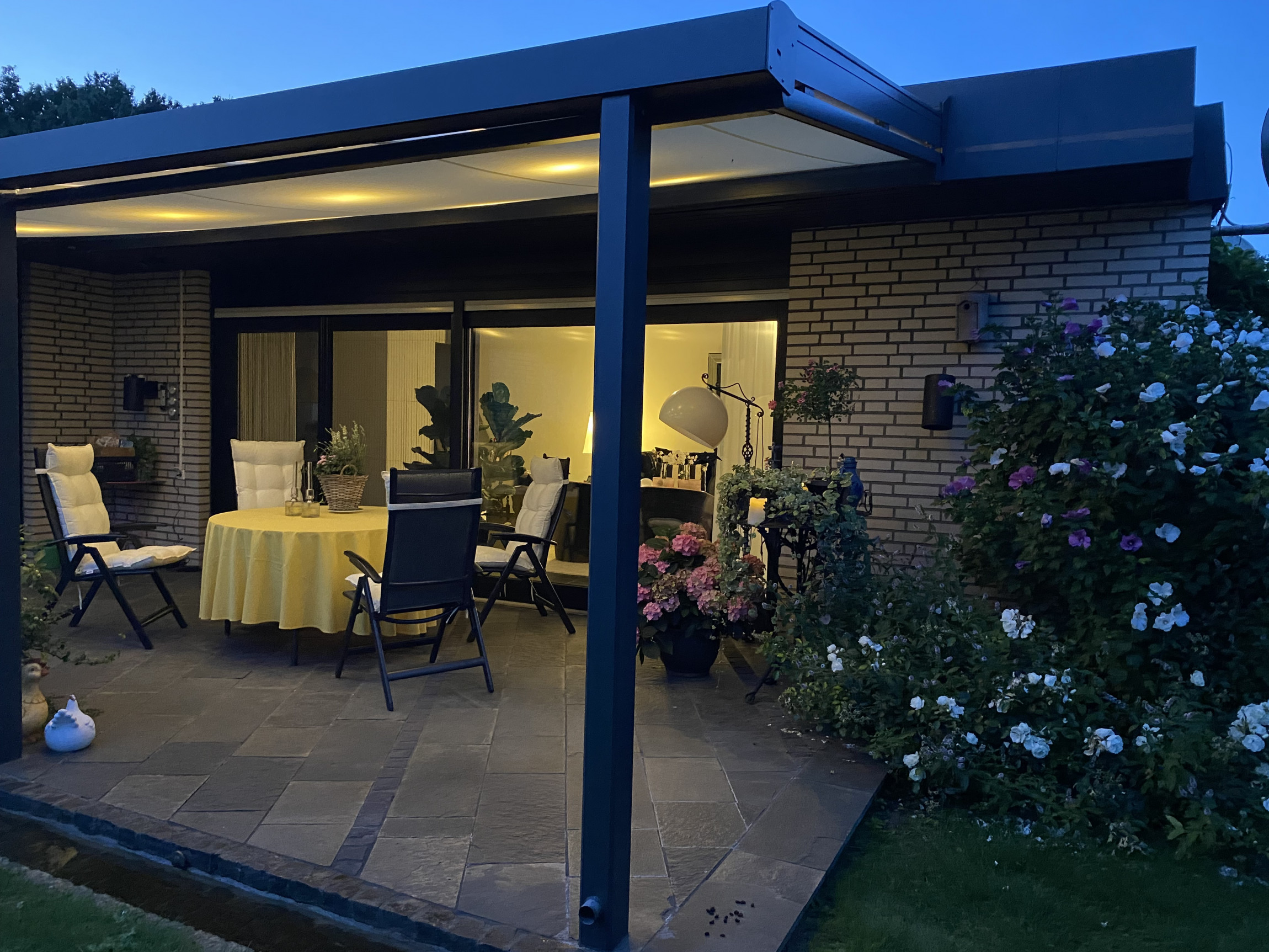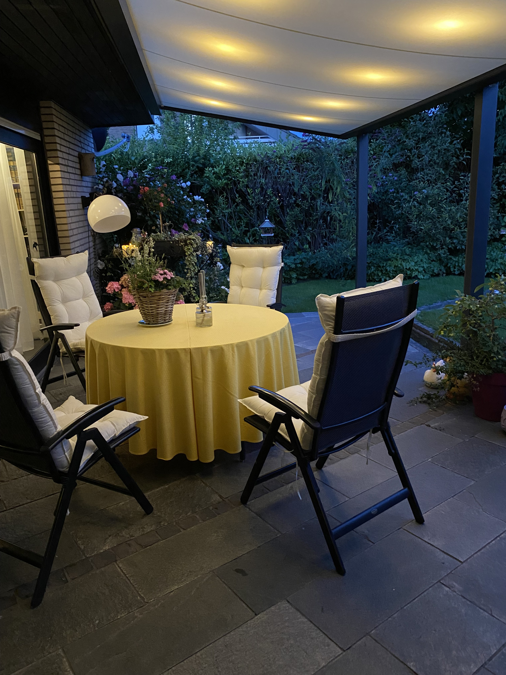 Die Terrasse liegt zum Süden und konnte bislang bei Sonnenschein nicht lange genutzt werden. Nun hat eine Überdachung der Terrasse mit einer darunter liegenden Markise und einer stimmungsvollen Beleuchtung Abhilfe geschaffen. Am Abend lässt sich die Terrasse mit heimelichem Licht wunderbar bewohnen, so dass auch so gar bis zum späten am Abend Karten gespielt werden kann.