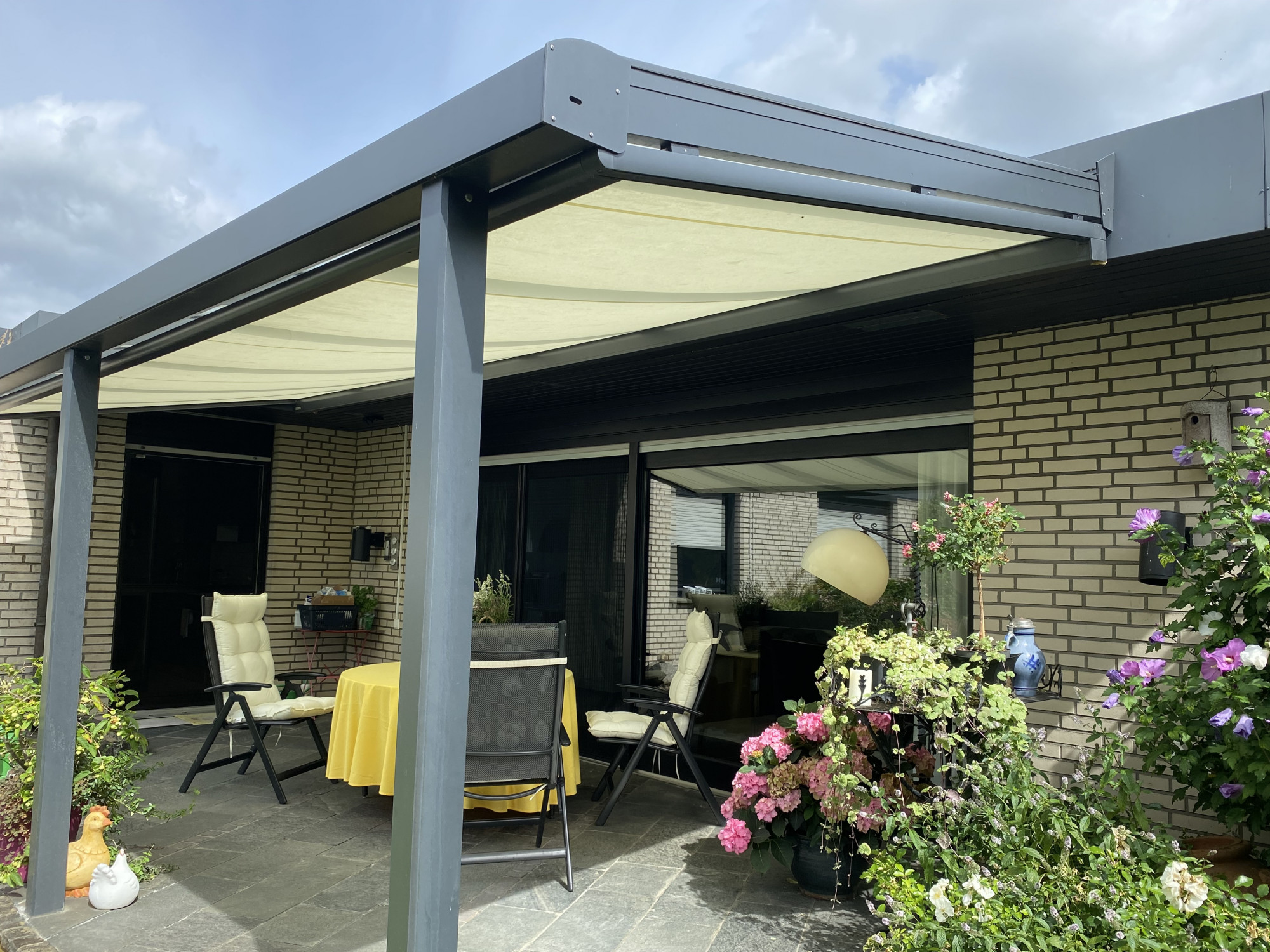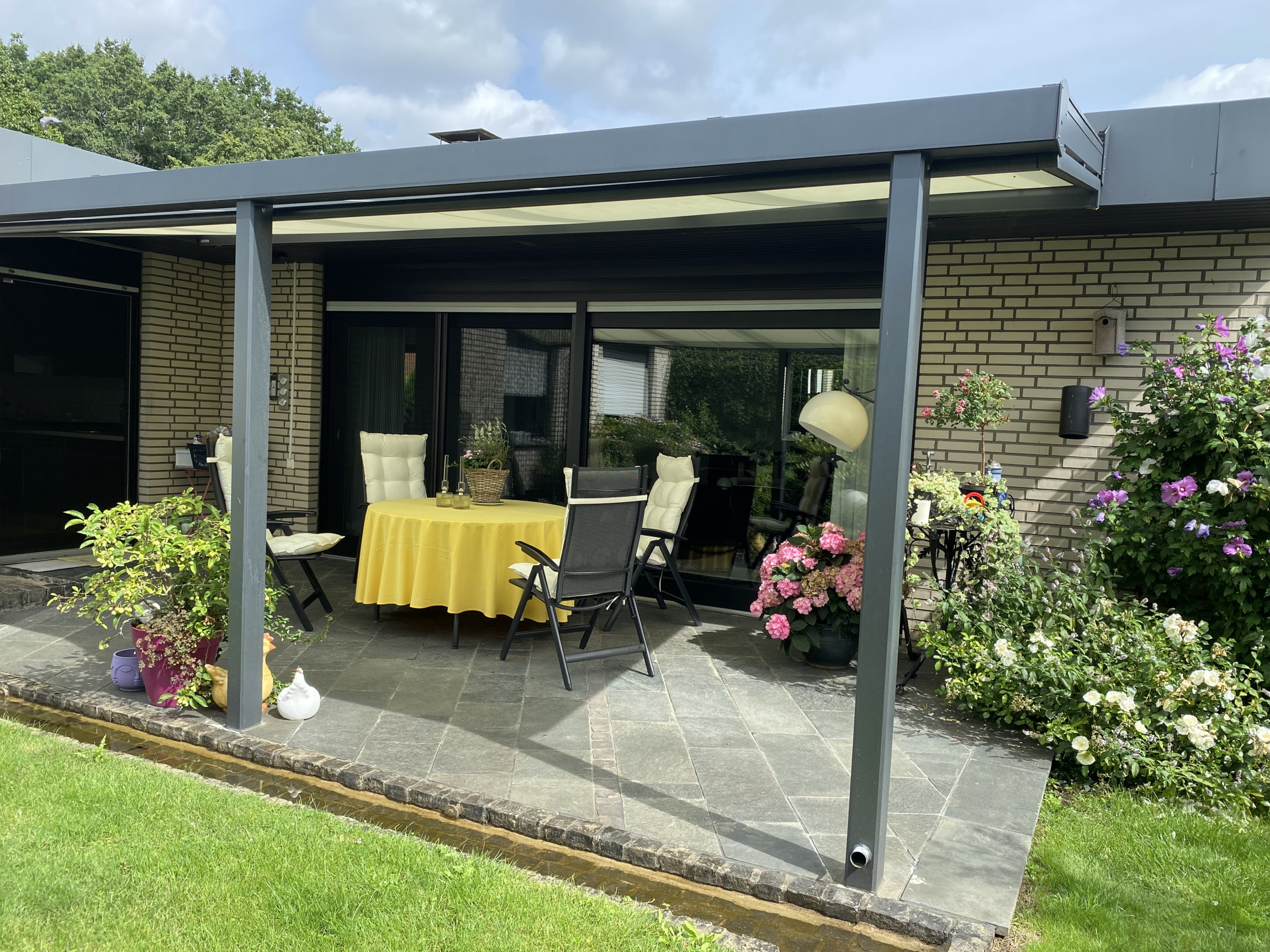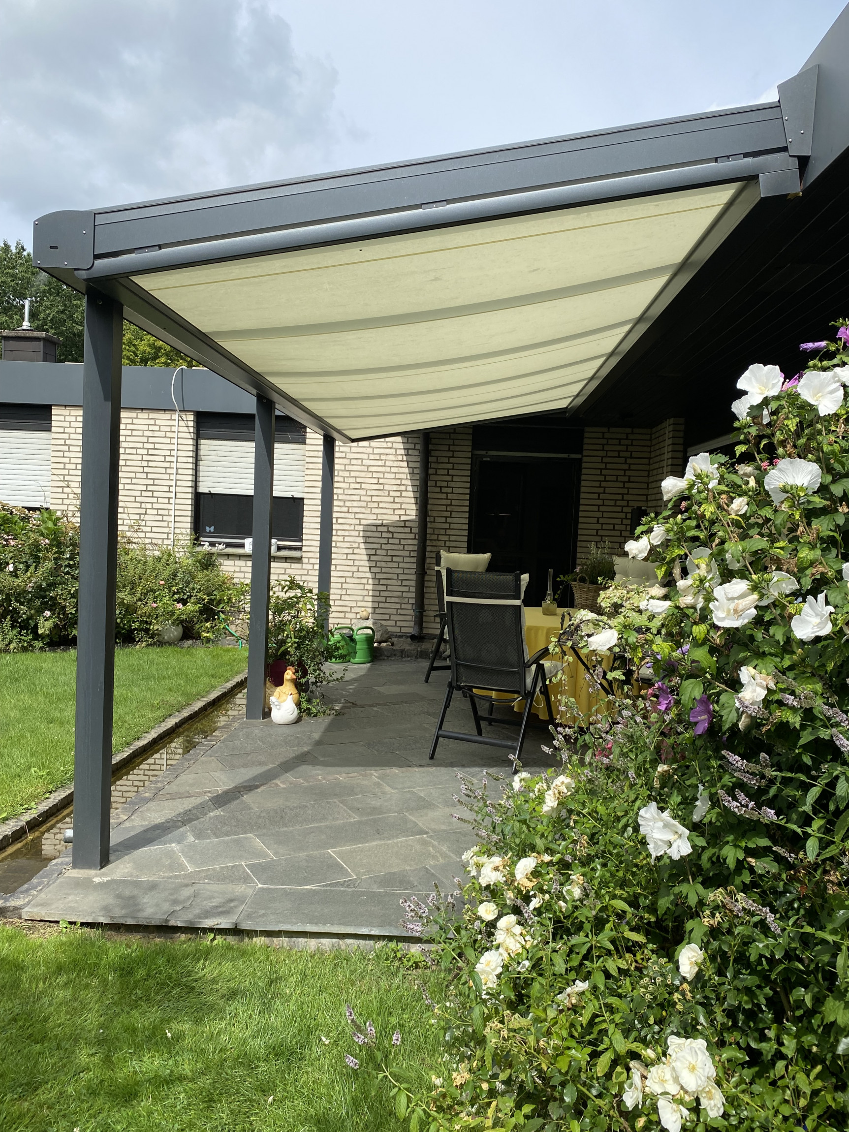 Die Terrasse liegt zum Süden und konnte bislang bei Sonnenschein nicht lange genutzt werden. Nun hat eine Überdachung der Terrasse mit einer darunter liegenden Markise und einer stimmungsvollen Beleuchtung Abhilfe geschaffen. Am Abend lässt sich die Terrasse mit heimelichem Licht wunderbar bewohnen, so dass auch so gar bis zum späten am Abend Karten gespielt werden kann.