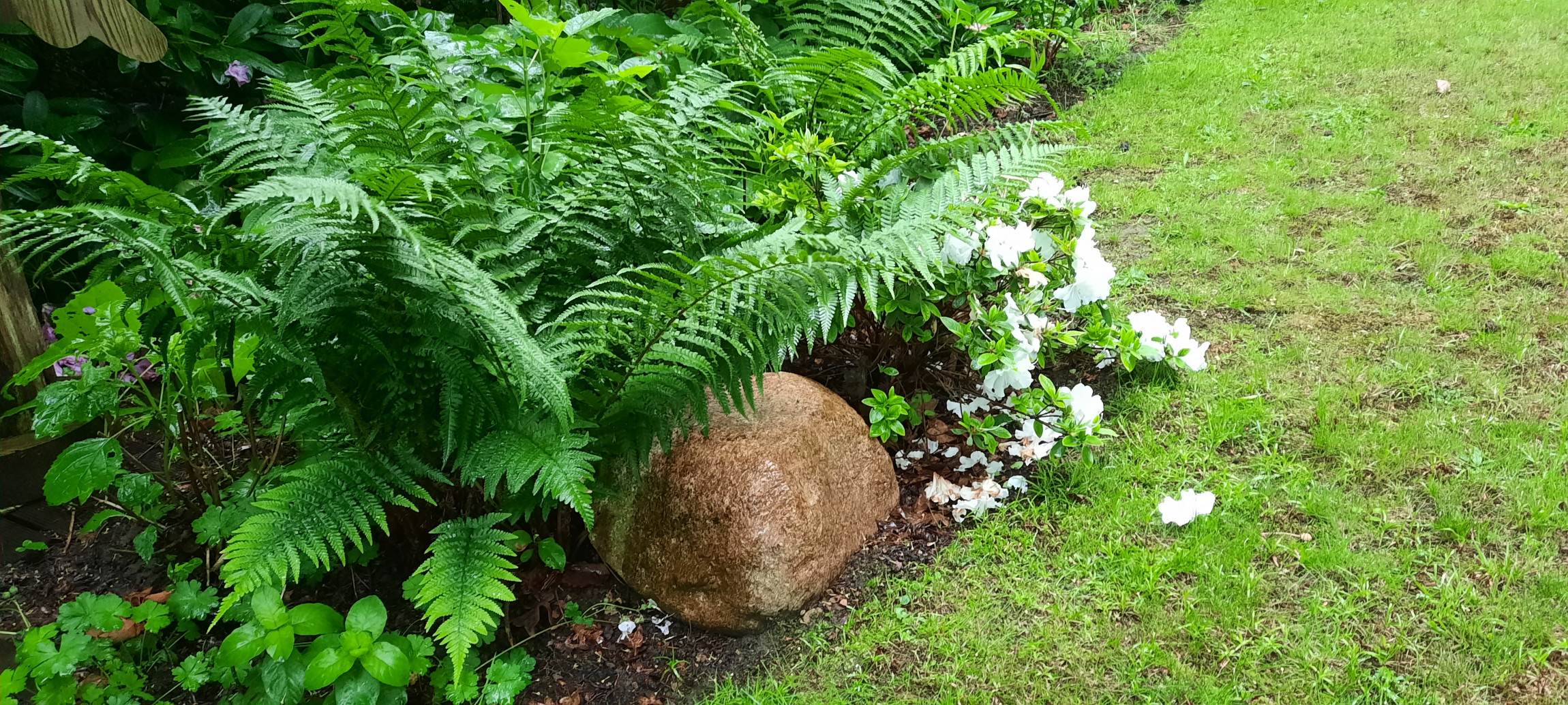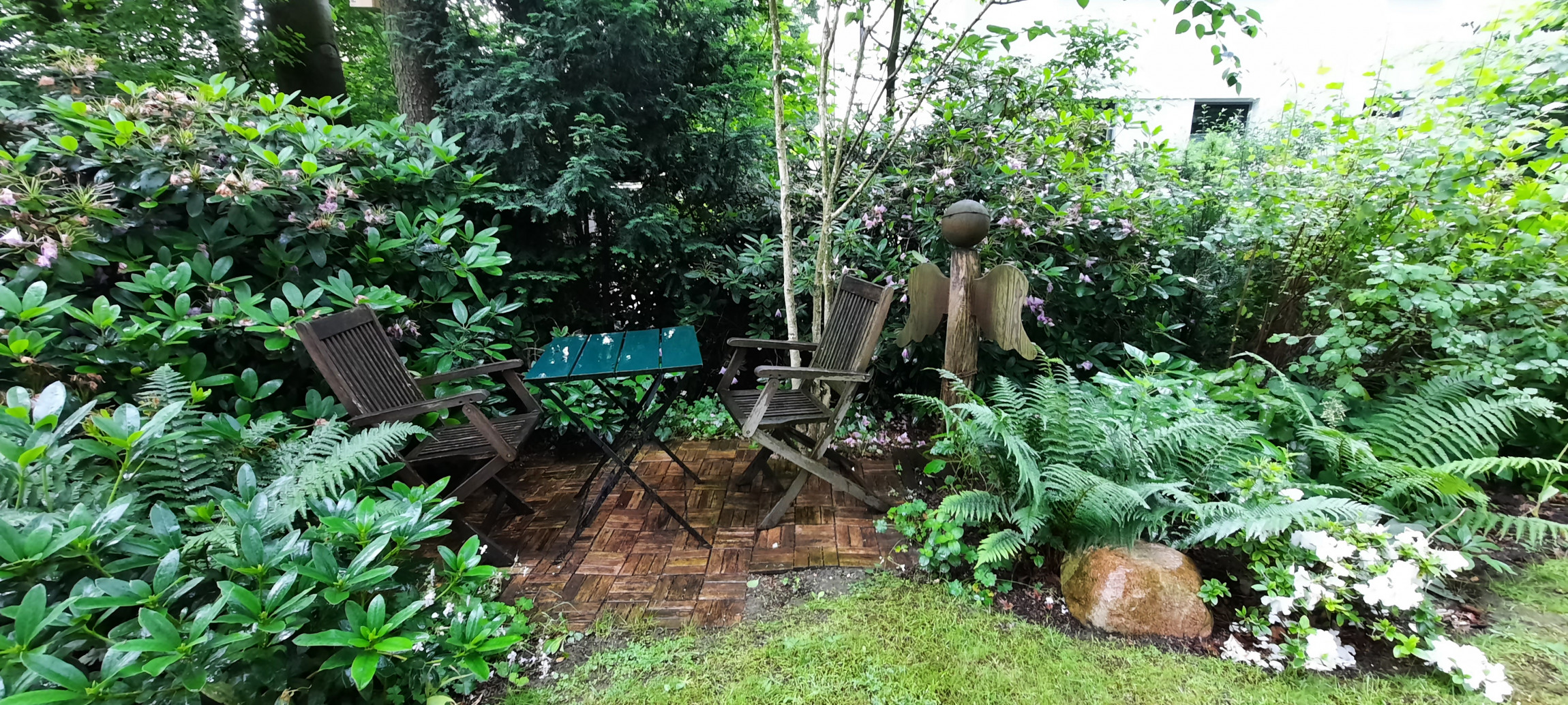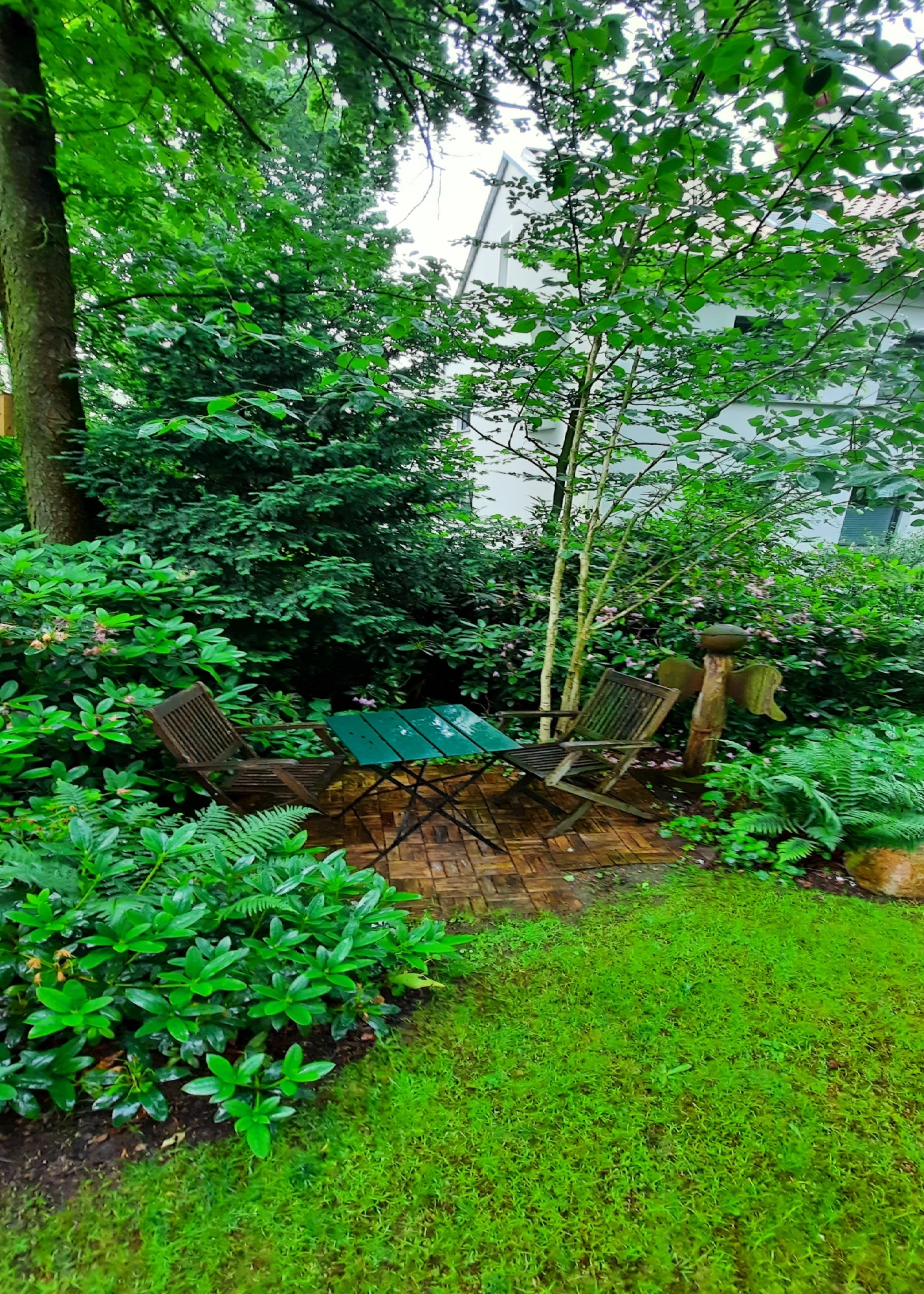 Mit dem Gartensitzplatz im Grünen habe ich eine neue Perspektive geschaffen: Nicht vom Haus in den Garten, sondern vom Garten aufs Haus. Beschirmt von einer mehstämmigen Himalaya-Birke und umrahmt von Rhododendren ist ein kleiner geschützter Platz entstanden.