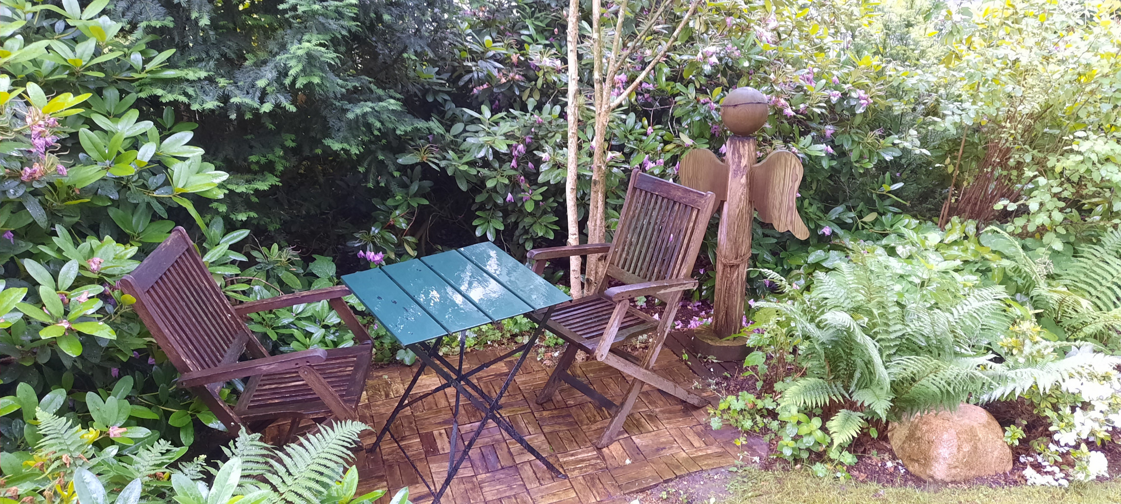 Mit wenig Mitteln ist das gelungen: Boden ebnen, Holzfkiesen verlegen, Mobiliar aufstellen und den Rand bepflanzen. Etwas Gartenkunst darf dabei nicht fehlen: Ein Engel aus einem alten Eichen-Weidepfahl "beschützt" das ruhige Plätzchen.